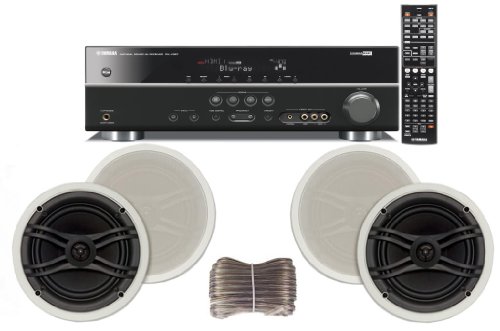 Yamaha 3D-Ready 5.1-Channel 500 Watts Digital Home Theater Audio/Video Receiver with 1080p-compatible HDMI repeater & Upgraded CINEMA DSP + Yamaha Custom Easy-to-install Natural Sound In-Ceiling Flush Mount 2-Way 120 watt 2 Speaker Set (1 Pair) with 1" Tweeters & 8" Woofer + 100ft 16 AWG Speaker Wire