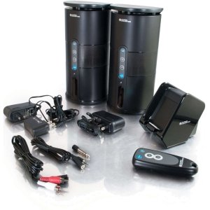 Product Name: Premium Speaker System. Marketing Information: Listen to music just about anywhere without the hassle of running speaker wire! These high-quality, weather-resistant speakers can even be used in wet areas. Powered by 900MHz Phase Loop Lock circuitry which automatically locks in and keeps the audio signal clear and strong within a range of up to 150 feet with no line of sight limitations. The signal works just like high powered wireless 900MHz phones delivering a crystal clear signal through walls or any other obstacles in your yard truly offering endless installation options.. Product Type: Speaker System. Operating Distance: 150 ft. Speaker Configuration: 2.0. RMS Output Power: 10 W. PMPO Output Power: 20 W. Wireless Speaker(s): Yes. iPod Supported: Yes. Input Voltage: 9 V DC. Color: Black. Height: 5.1". Width: 10.4". Package Contents: