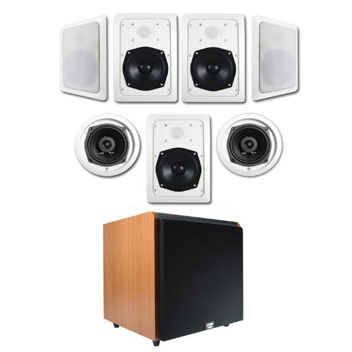 This Acoustic Audio 7.1 channel multi-speaker system features 5 perfectly matched in-wall speakers and a cherry 12" powered HD Series subwoofer. The system consist of five rectangular 5.25" 2-way in-wall/ceiling speakers, two round 5.25" 2-way in-wall/ceiling speakers, and one cherry 12" high definition powered sub. Because the speakers mount seamlessly into any wall or ceiling, there is no need to worry about unsightly speaker wire cluttering up your home or office. Each two-way speaker features polypropylene cones with soft dome tweeters and butyl rubber surrounds. The HD sub sports an 12" front-firing woofer with a woven Kevlar cone and has a built-in 800 watt amplifier. The advanced bass reflex cabinet is equipped with a rear slotted bass port. It has an adjustable gain control and a variable crossover so you can perfectly match the bass response with your speakers. The high and low inputs let you use any receiver or amplifier and its cherry finish fits with any decor.